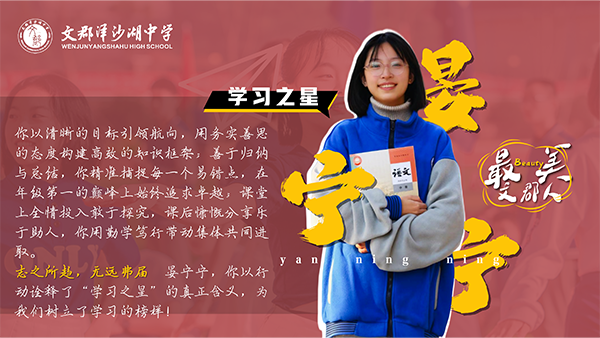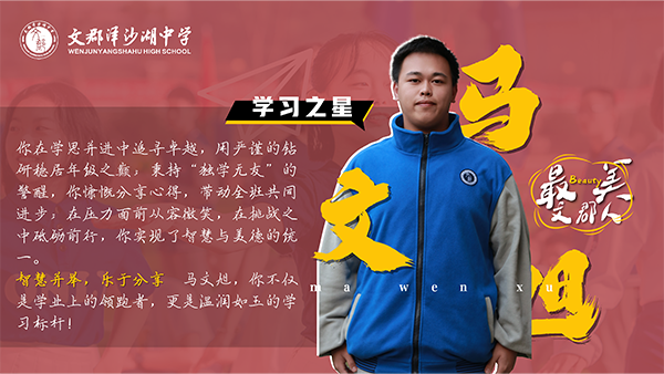 你在学思并进中追寻卓越,用严谨的钻研稳居年级之巅;秉持“独学无友”的警醒,你慷慨分享心得,带动全班共同进步;在压力面前从容微笑,在挑战之中砥砺前行,你实现了智慧与美德的统 智慧并举,乐于分享 马文旭,...
