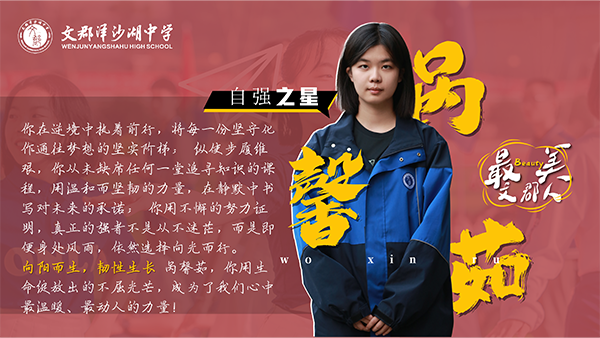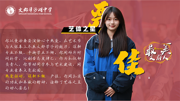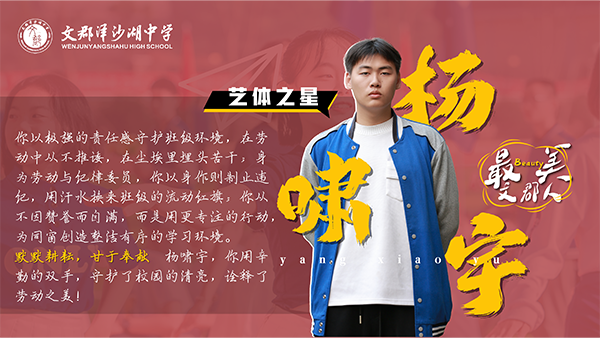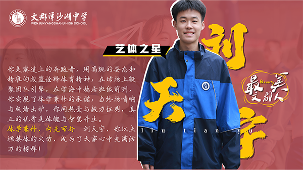 你是赛道上的奔跑者,用高跳的姿态和精准的投篮诠释体育精神;在球场上凝聚团队引擎,在学海中稳居班级前列,你实现了体学兼修的承诺,当终场哨响与成绩出炉,你用热爱与毅力证明,真正的优秀是体魄与智慧并生。体学兼修,向光...