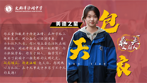 你在重阳敬老中传递温情,在研学路上传承基因,用公益之心浸润青春;身为礼仪队队长,你以端庄姿态活跃在颁奖现场,用优秀服务赢得一致称赞;作为班级学委,你乐于助人、勤学笃行,成为了校园中一抹亮眼的文明之光。仪态端庄,...