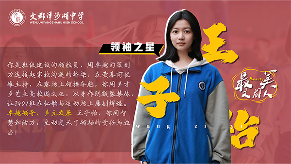 你是班级建设的领航员,用卓越的策划力连接起家校沟通的桥梁;在荧幕前优雅主持,在赛场上领操夺魁,你用多才多艺点亮校园文化,以身作则凝聚集体让2401班在红歌与运动场上屡创辉煌。卓越领导,多元发展 王子怡,你用智...