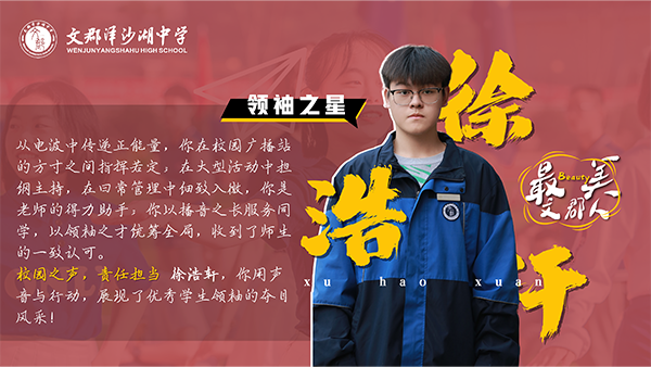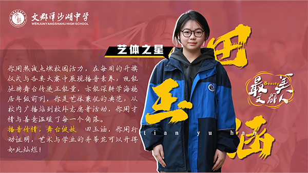 你用热诚点燃校园活力,在每周的升旗仪式与各类大赛中展现播音素养;既能驰骋舞台传递正能量,亦能深耕学海稳居年级前列,你是艺体兼优的典范;从校内广播站到校外志愿者活动,你用才情与善意温暖了每一个角落。 播...