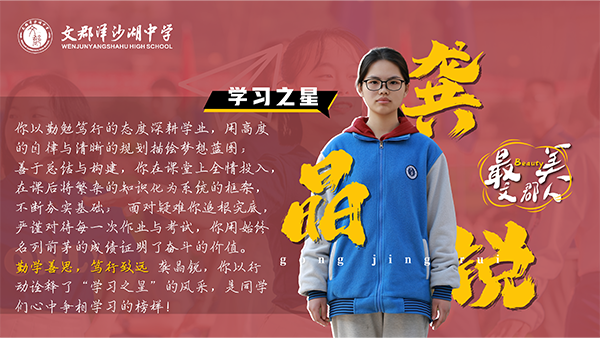 你以勤勉笃行的态度深耕学业,用高度的自律与清晰的规划描绘梦想蓝图;善于总结与构建,你在课堂上全情投入,在课后将繁杂的知识化为系统的框杂,不断夯实基础;面对疑难你追根究底,严谨对待每一次作业与考试,你用始终名列前...
