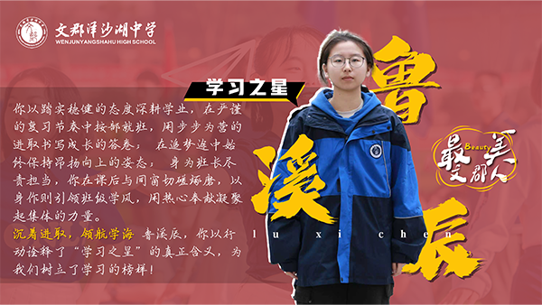 你以极强的责任感守护班级环境,在劳动中从不推诿,在尘埃里埋头苦干;身为劳动与纪律委员,你以身作则制止违纪,用汗水换来班级的流动红旗;你从不因赞誉而自满,而是用更专注的行动为同窗创造整法有序的学习环境。默默耕耘,...