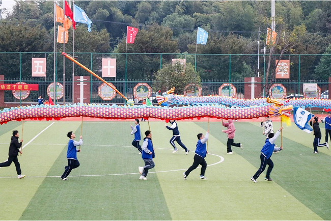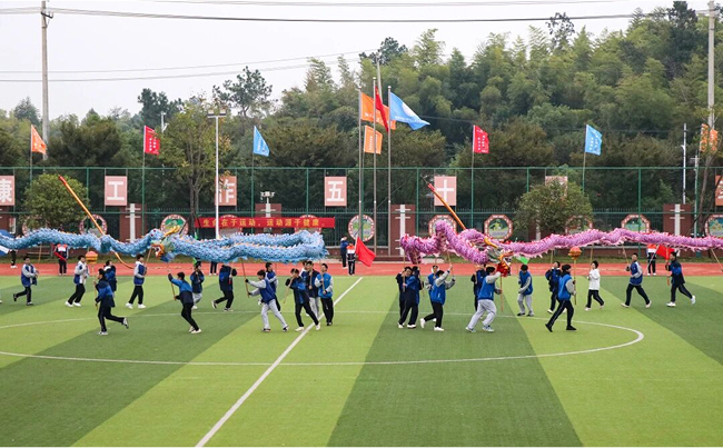 19日岳阳市“湘超”赛场的余音未落,队伍征程续写,于21日登台湘阴县第二中学,为第32届中学生田径运动会助兴暖场。秋日的赛场,人声鼎沸,汇成一片温暖的海洋。蓦然间,一抹亮眼的“红黄蓝金色彩”撕裂了喧嚣,如旭日破云,似烈焰腾空——文郡洋沙湖中学舞龙舞狮队,惊艳登场。那龙,是鎏金的闪电,在鼓点中苏醒。它虬曲、翻腾、跃动,鳞片折射着千年光阴,仿佛一条自神话游来的河流,骤然注入青春的赛道。