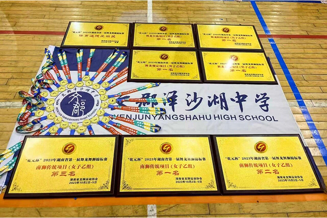 文郡洋沙湖中学舞龙舞狮队自2021年8月成立以来,龙狮队已成为学校的文化名片。队伍战绩彪炳,硕果累累:2023年征战“乾元杯”湖南首届舞龙舞狮锦标赛斩获5金1银1铜;2024年荣誉再升级,9月亮相“我要上全运”第15届舞龙舞狮比赛,最终获得6金4银4铜的亮眼战绩;同年登上“2024年全国社区春晚”,以富有感染力的表演斩获一等奖......承载过往,荣耀队伍并未止步,接下来将全力备战11月湖南省第三届舞龙舞狮锦标赛,力求再创佳绩。