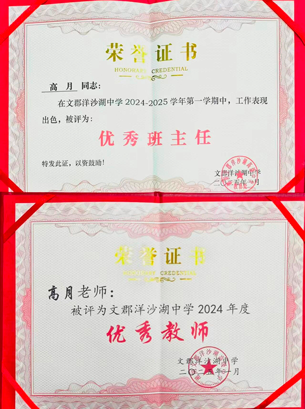桃李不言,下自成蹊。高月老师用她的专业、责任与爱心,完美诠释了“师者”的深刻内涵。她就像一座灯塔,照亮学生前行的道路;她也像一位辛勤的园丁,守护着每一朵花的绽放。在文郡洋沙湖中学这片教育的沃土上,我们为拥有高月老师这样的优秀教育者而自豪。相信在她的带领下,将有更多的学子,将优秀变成习惯,用扎实的脚步,走向灿烂的未来。