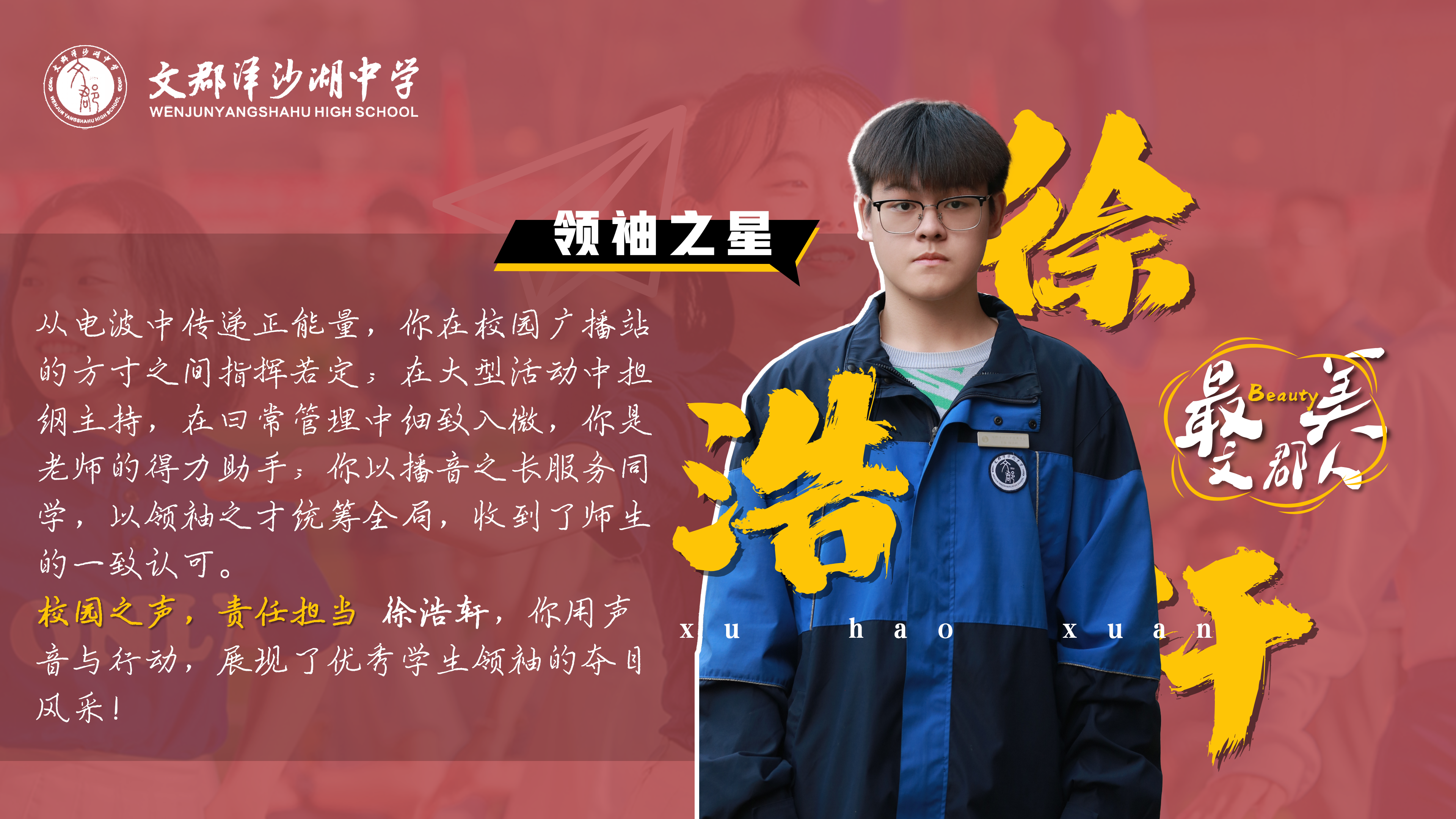 从电波中传递正能量,你在校园广播站的方寸之间指挥若定,在大型活动中担纲主持,在回常管理中细致入微,你是老师的得力助手;你以播音之长服务同学,以领袖之才统筹全局,收到了师生的一致认可。 校园之声,责任担当 徐浩轩,你用声音与行动,展现了优秀学生领袖的夺目风来!