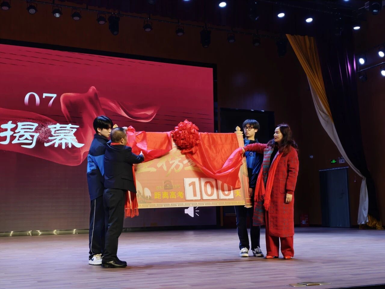 执行董事长夏电收女士与党支部书记谈万里同志共同为高考百日倒计时揭幕。鲜红的倒计时牌熠熠生辉,标志着冲刺征程正式开启,全场掌声雷动,热血沸腾。