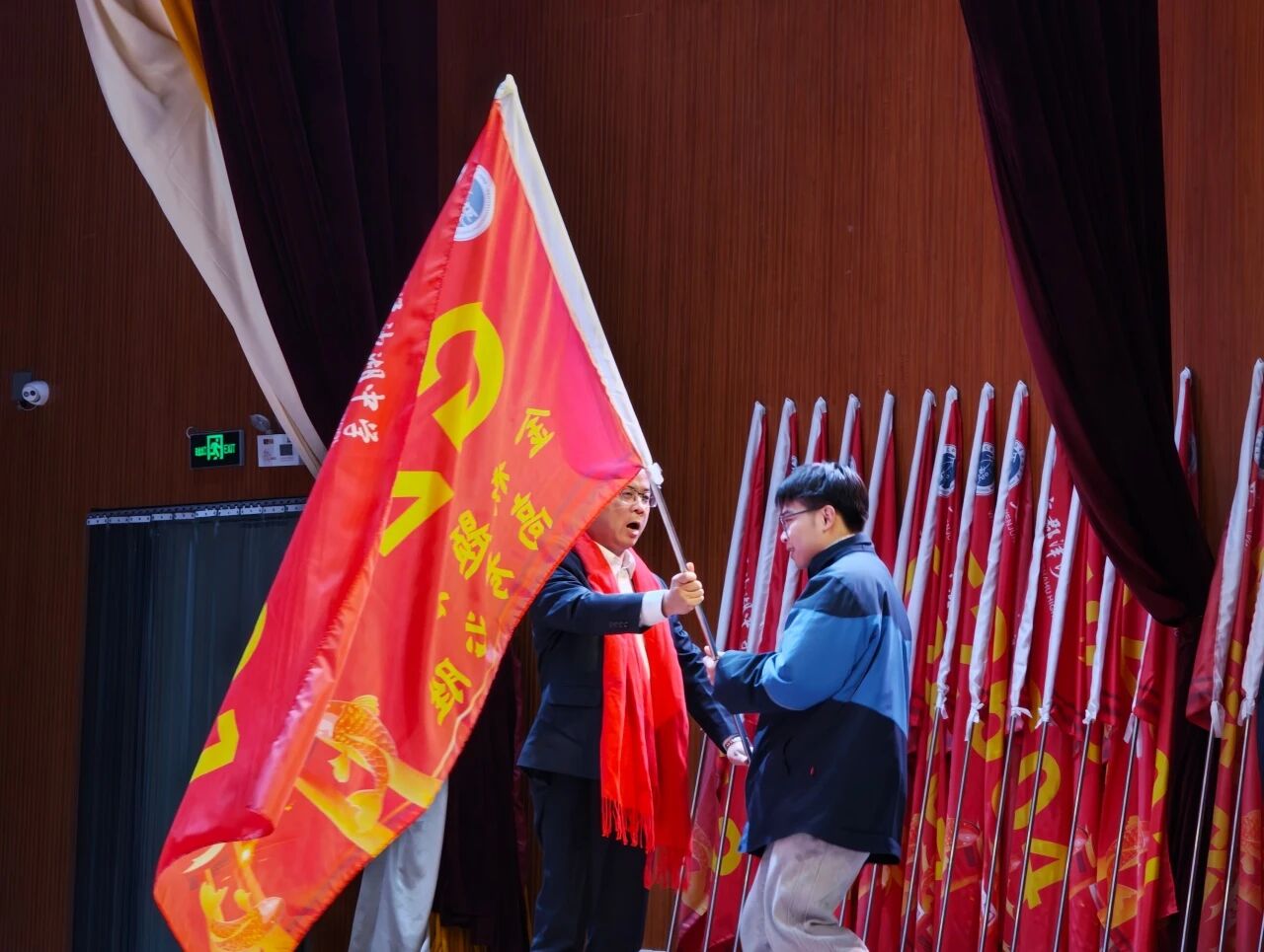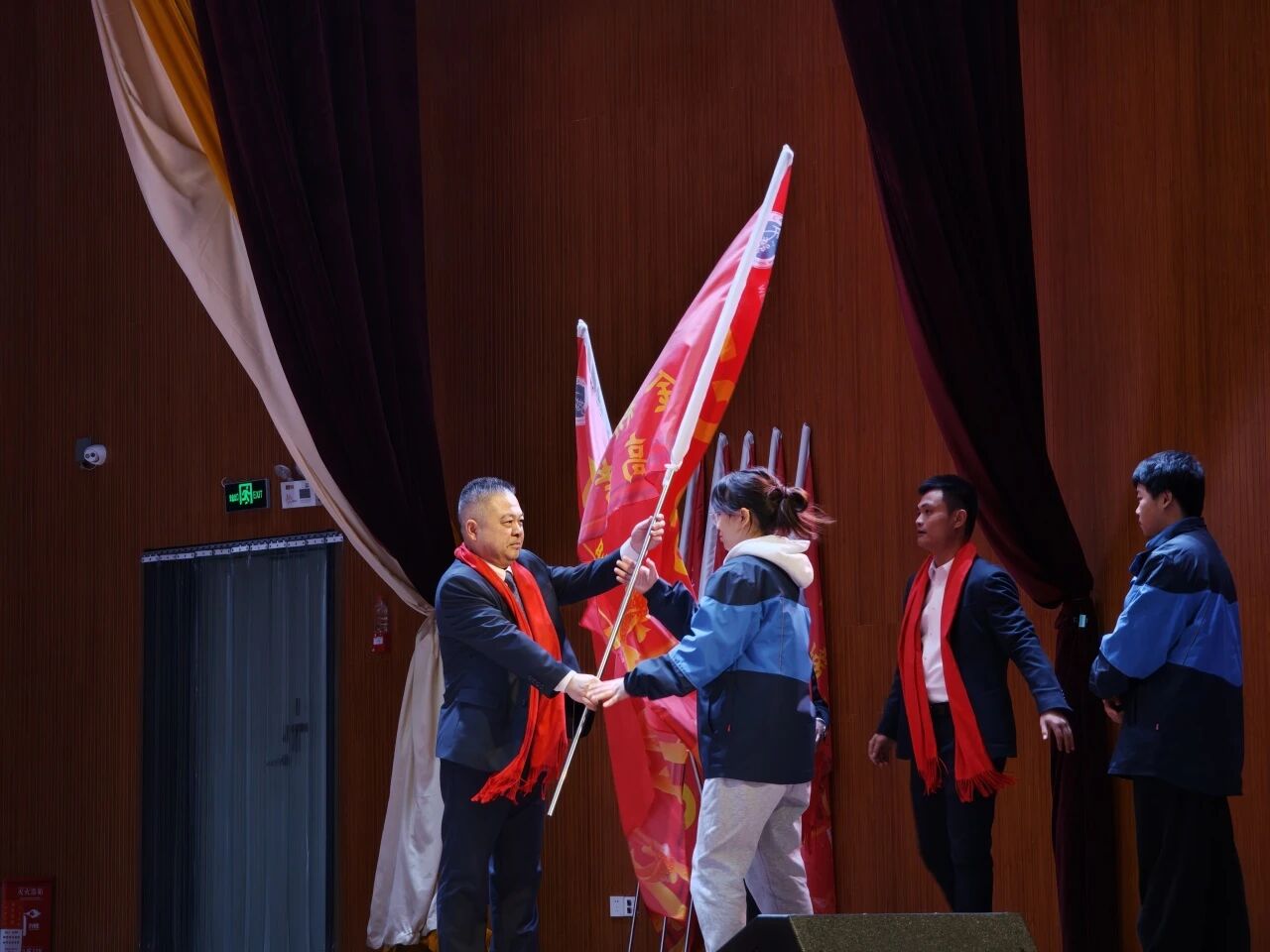 甘宇副校长和姜海洲主任将战旗逐一授予各班班长。一面面旗帜承载着班级信念与奋斗目标,猎猎作响,鼓舞着每一位同学奋勇争先、旗开得胜。