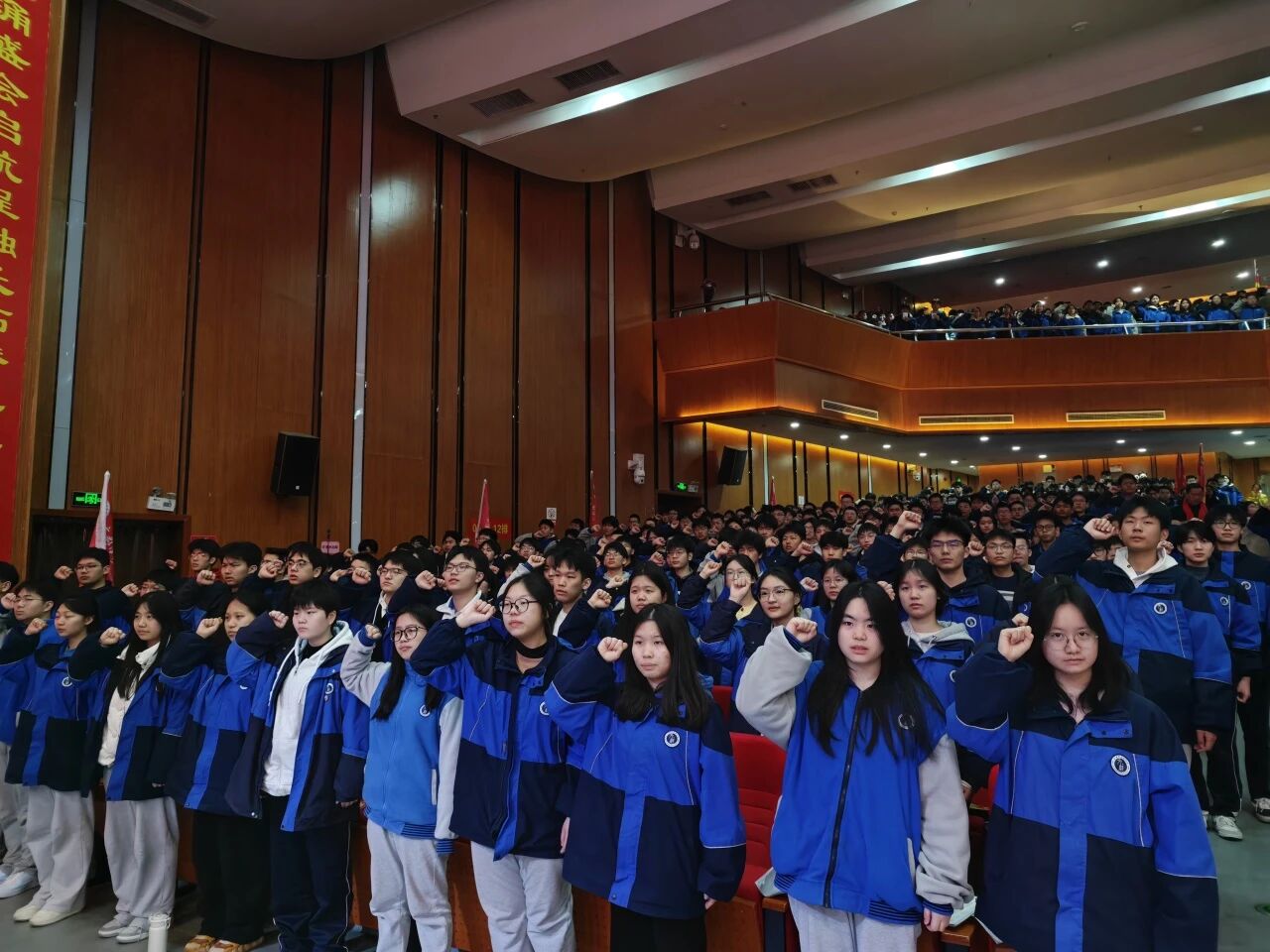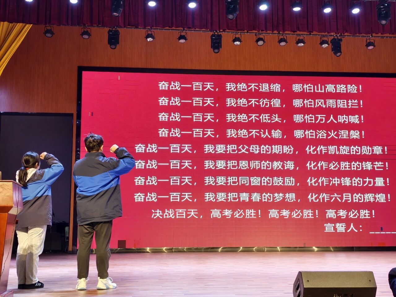 全体学子高举右拳,集体宣誓。誓言铿锵有力、响彻会场,展现出洋沙湖学子百日拼搏、决战高考、不负众望、必创辉煌的磅礴气势与必胜信念。