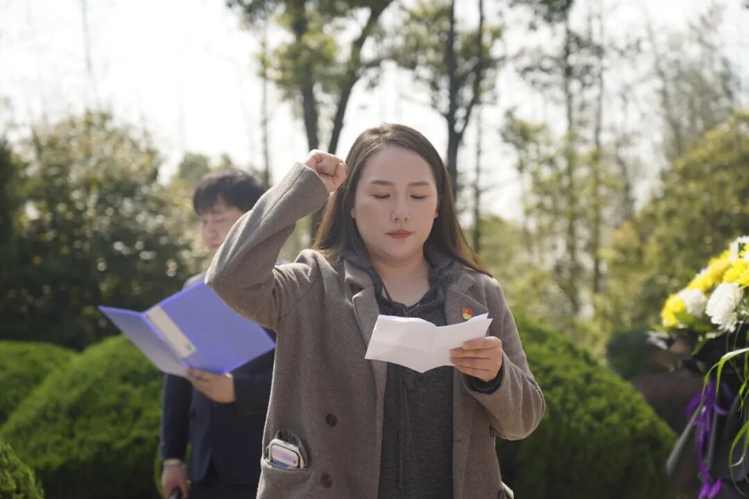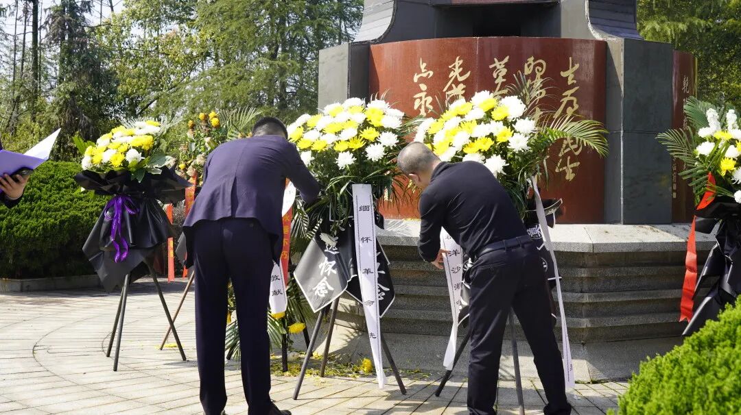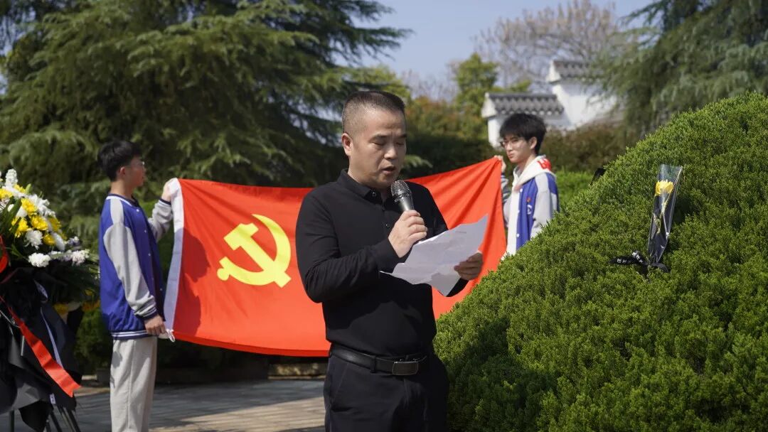 活动现场庄严肃穆,全体师生整齐列队、神情肃穆。在烈士纪念碑前,党支部书记谈万里、组织委员陈浩缓步上前,向革命烈士敬献花圈,洁白的花圈承载着全校师生对英烈的无限敬仰与深切缅怀。随后,全体人员肃立默哀一分钟,在静默中追思先烈舍生取义、为国捐躯的崇高精神,铭记那段峥嵘烽火岁月。党支部书记谈万里同志现场宣读祭文,深情寄托哀思,告慰英烈忠魂。